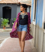 This maroon patterned women's long jacket is made from Ikat handcrafted fabric created from 100% fine cotton yarn. It makes for a fashionable add-on for any attire and all occasions.