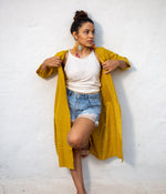 This mustard-white patterned women's long jacket is made from Ikat handcrafted fabric created from 100% fine cotton yarn. It makes for a fashionable add-on for any attire and all occasions.