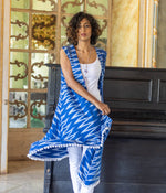 This blue-white chevrons womens shrug made from handcrafted Ikat fabric and embellished with cotton pom-poms makes it a fashionable add-on for any attire and all occasions.