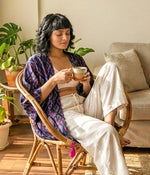 Bold, breezy, and unapologetically chic — this Navy Ikat Handloom Kimono is for the woman who blends boardroom confidence with weekend ease. Handwoven in soft cotton with a modern Ikat pattern, it’s the ideal throw-on layer that elevates even the simplest outfit. Thoughtfully designed with two functional side pockets, it adds everyday utility to its relaxed, flowing silhouette. The cropped sleeves and subtle tassel detailing bring in just the right dose of boho attitude without trying too hard. Pair it with crisp whites, structured trousers, or even a dress — it’s your go-to piece for turning heads from work meetings to rooftop evenings.