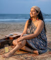 The soft drape and relaxed shape encourage ease—whether seated on warm sand, listening to music, or simply watching the horizon. Subtle irregularities in the weave reflect the human hand behind the fabric, giving the dress a lived-in softness that deepens with wear.